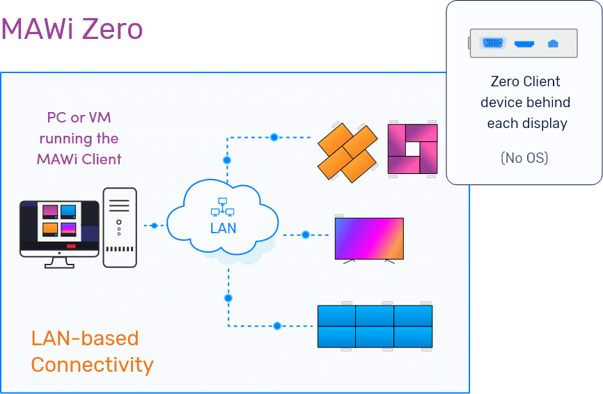 Moreover, when paired with Zero clients or MAWi Players, our technology overcomes distance limitations, providing increased flexibility and scalability for deploying digital signage solutions.